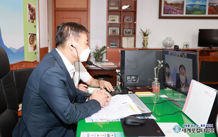 | ▲전춘성 진안군수가 미야자키현 아야정장과 영상 간담회를 진행하고 있다.(사진=진안군 제공) |