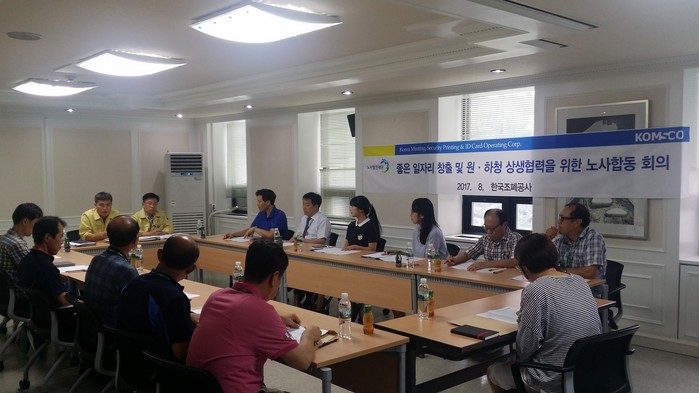 | ▲28일 조폐공사가 기간제 근로자의 정규직 전환을 심의하기 위해 비정규직, 노사 대표 등 관계자들이 모여 정규직 전환을 논의하고 있다.<사진제공=조폐공사> |