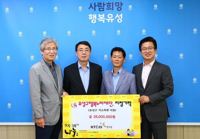 | ▲19일 유성구 행복사랑방에서 허태정 구청장(맨 오른쪽)이 김도훈 KT&G 기획실장(왼쪽 두 번째)과 박준용 지원팀장(왼쪽 세 번째)으로부터 성금 2500만원을 기탁받고 있다. |