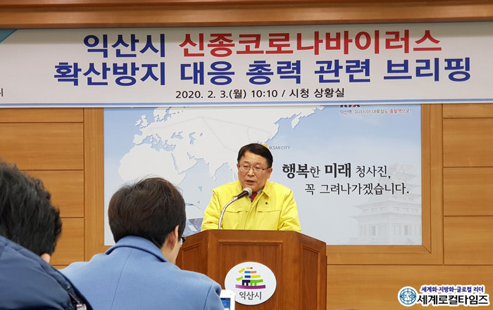 | ▲2020년 2월 3일, 정헌율 익산시장이 코로나19 브리핑을 진행하고 있다 (세계로컬타임즈 DB) |