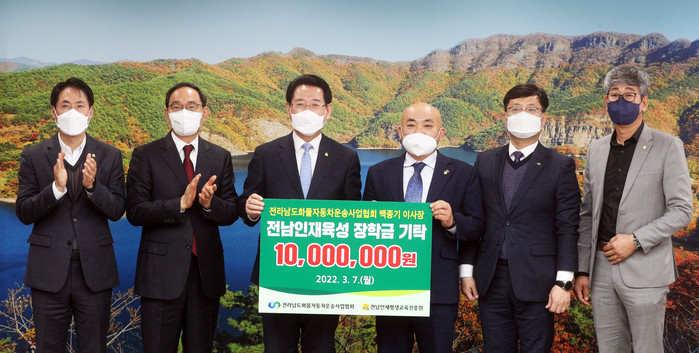 [세계로컬타임즈 김명진 기자] 전라남도화물자동차운송사업협회(이사장 백종기)가 지난 7일 (재)전남인재평생교육진흥원에 전남 인재 육성에 써달라며 1천만 원을 기탁했다.