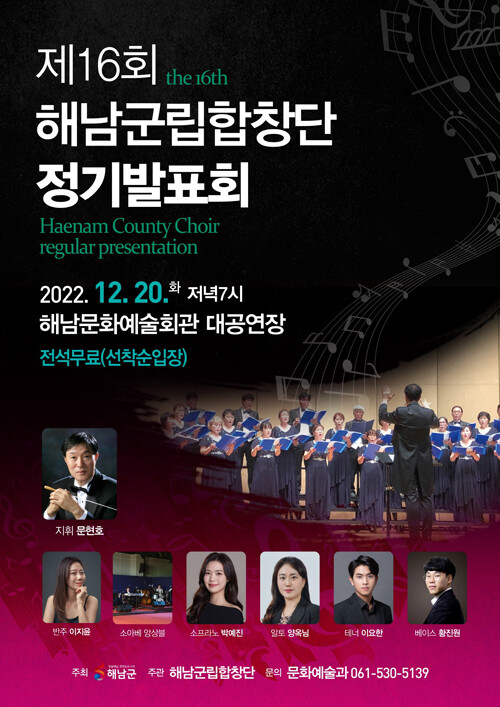 해남군에 따르면 해남문화예술회관 대공연장에서 열리는 이번 공연을 위해 올해 다시 신규단원을 모집하는 등 본격적인 활동을 재개했으며 지휘자 문현호, 반주자 이지윤씨가 무대에 오른다.