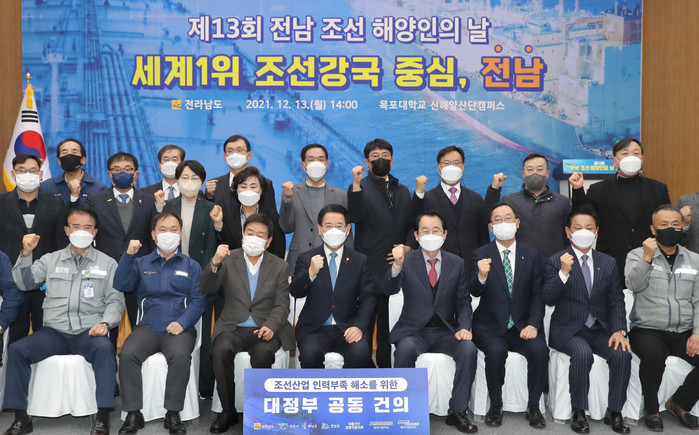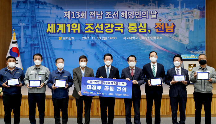 전남도는 13일 목포대학교 신해양산단캠퍼스에서 도내 조선.해양기업 대표 및 노동자, 유관기관, 지자체 관계자 70여 명이 참석한 가운데 ‘제13회 전남 조선·해양인의 날’을 개최하고, 조선인력 부족 해소를 위한 대정부 공동건의문을 채택했다.