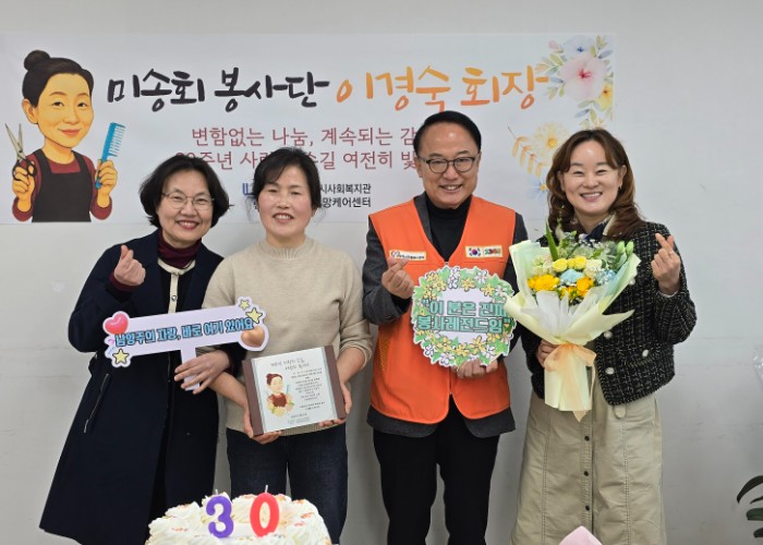 미송회봉사단은 현재 5명의 단원으로 구성되어 있으며 지역의 어르신과 취약계층을 대상으로 이미용 봉사를 지속하고 있다. 특히 이경숙 회장은 지난 30년간 재능나눔을 실천하며 지역사회 돌봄의 든든한 버팀목 역할을 해왔다.