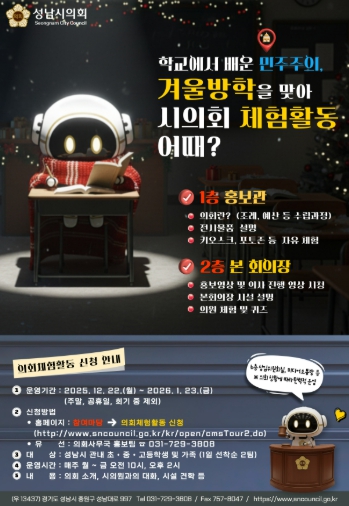 [세계로컬타임즈] 성남시의회는 겨울방학을 맞아 관내 초·중·고등학생과 가족을 대상으로‘가족과 함께하는 겨울방학 의회 체험활동’을 오는 12월 22일부터 2026년 1월 23일까지 운영한다.