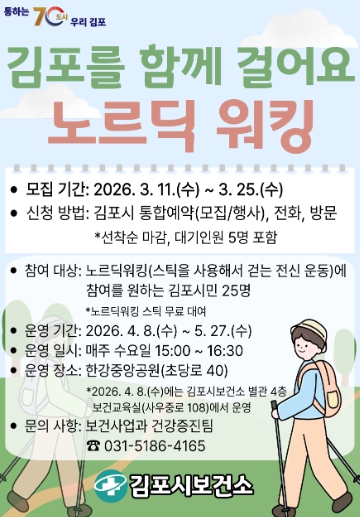 모집 대상은 올바른 보행과 북유럽식 걷기(노르딕 워킹)에 관심 있는 20세 이상 김포시민 25명으로, 참여를 원하는 시민은 신분증을 지참해 보건소를 방문하거나 전화 또는 김포시 통합예약시스템(모집·행사)을 통해 신청하면 된다.