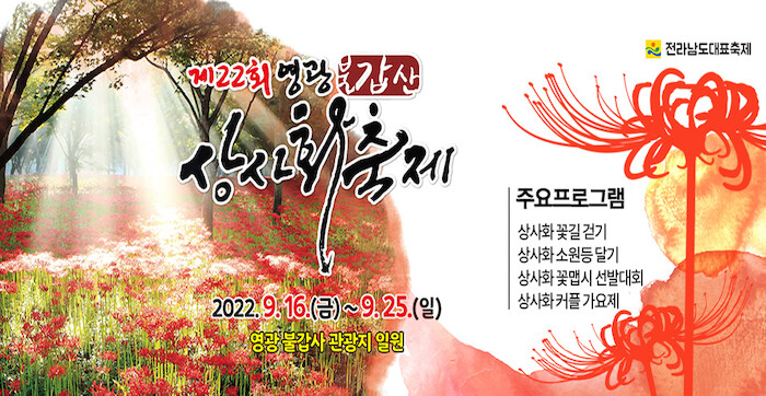 [세계로컬타임즈 이남규 기자] 올해 22회를 맞는 영광 불갑산 상사화축제가 오는 9월 16일부터 25일까지 영광군 불갑사 관광지 일원에서 열린다.