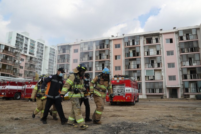 | ▲대전소방관들이 대덕구 중리주공아파트 지역에 규모 6.0의 강진이 발생해을 가정해 훈련을 펼치고 있다. <사진제공= 대전시청> |