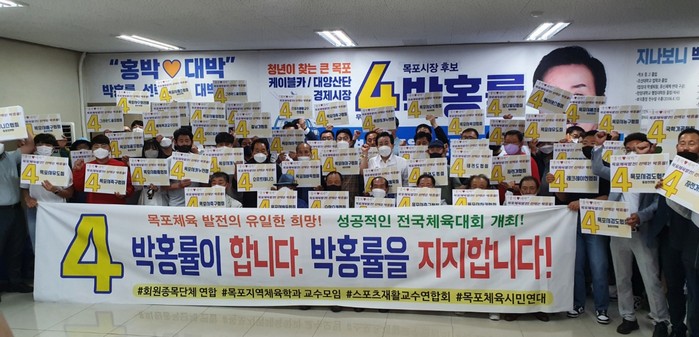 체육단체 대표 및 동호인, 체육회를 대표했던 체육원로 및 임원 100여명은 지난 25일 선거사무소를 찾아 “침체된 목포체육의 부흥을 기치로 내걸고 목포체육 발전의 위해 노력하는 박홍률 후보의 능력과 진실을 믿는다”라며 박홍률 후보 지지를 선언했다.