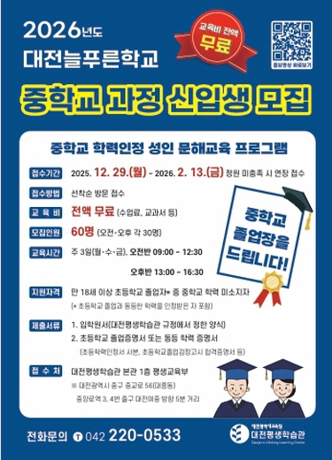 한편, 대전 유일의 중학교 학력인정 문해교육 과정을 운영하는 대전늘푸른학교는 현재 중학교 과정 6학급과 방송통신고 수업 연계 고등학교 지원과정 3학급을 운영하고 있다. 2015년 중학교 학력인정 문해교육 운영기관으로 지정된 이후 지난해 졸업생 24명을 포함해서 374명의 졸업생을 배출했다.