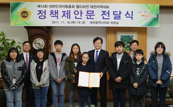 이날 전달된 정책제안문은 지난 7월 22일 월드비전이 주최한 제14회 대한민국아동총회 대전지역대회에서 채택된 지역 아동들의 요구가 담겨있는 제안문이다.