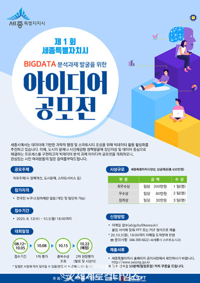 [세계로컬타임즈 조주연 기자] 세종특별자치시가 시민이 직접 빅데이터(BD) 활용 아이디어를 제안하는 공모전을 개최한다.