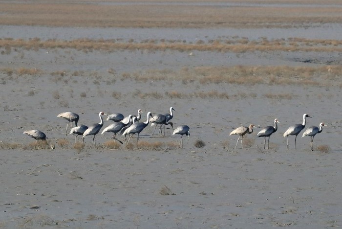 지난 18일 지도갯벌에서 활발하게 먹이활동을 하는 재두루미 16개체가 확인됐다.