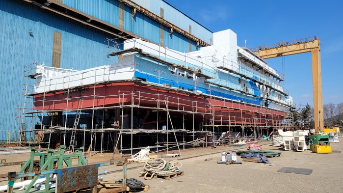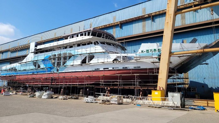 2020년 4월 사업 선정을 시작으로 2021년 7월 강재절단식을 거쳐 건조된 전기추진 차도선은 총 420톤(길이 49m, 승객 125명, 차량 20여대 선적가능) 규모로 현재 도장도포 마감공정을 완료하고, 건조장(대불산단 유일공장)에서 삽진산단(유일) 전용부두로 예인·이동 후 진수식을 위해 접안 대기 중이다.