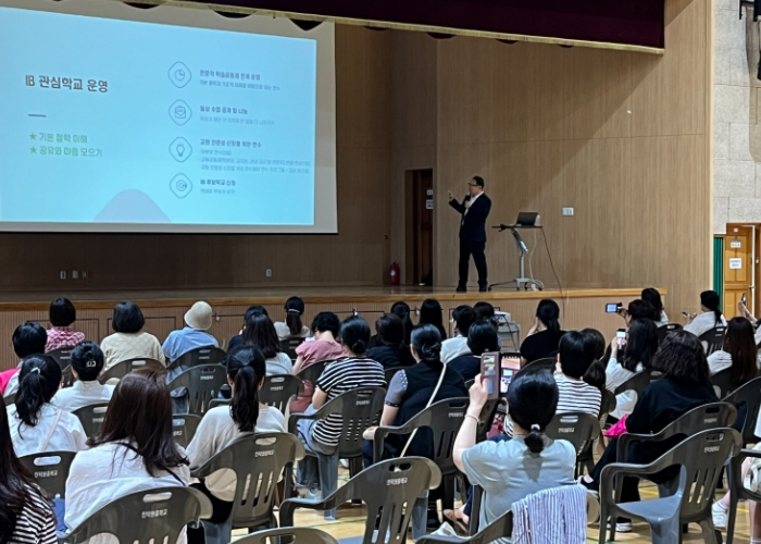 이날 강사로 참여한 인덕원중학교 김태훈 교장은 과거 IB 학교 운영 성과와 수업-평가 혁신 사례를 제시하며 IB 프로그램이 학생의 진로와 진학에 큰 도움을 줄 수 있음을 강조했다. 특히 초등학교 때부터 IB 교육프로그램에 참여했던 학생들이 토론과 논술 등에 더욱 강점을 지닐 수 있음도 함께 제시하면서 학부모들의 호응을 이끌어내었다.