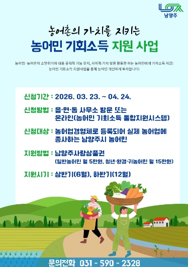 [세계로컬타임즈] 남양주시는 오는 23일부터 ‘2026년 농어민 기회소득 지원사업’을 신청받는다고 18일 밝혔다.