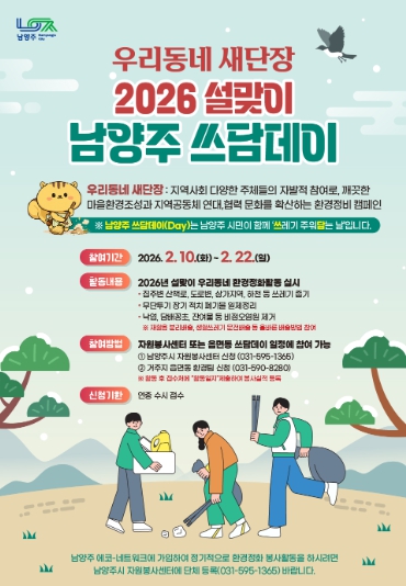 [세계로컬타임즈] 남양주시는 10일부터 22일까지 시 전역에서 ‘설맞이 우리동네 새단장 남양주 쓰담데이 집중 추진기간’을 운영한다고 밝혔다.