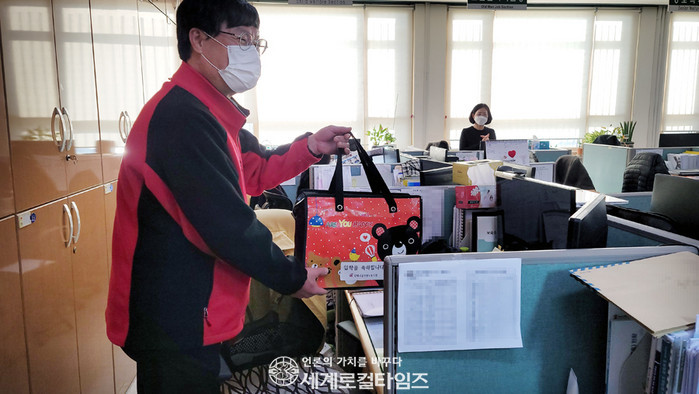 | ▲ 김제시 공무원노조 최지석 위원장이 초등학교 자녀 입학선물을 전하기 위해 한 실과를 찾아간 가운데 조합원이 출장 중이자 자리에 선물을 올려 놓고 있다. |