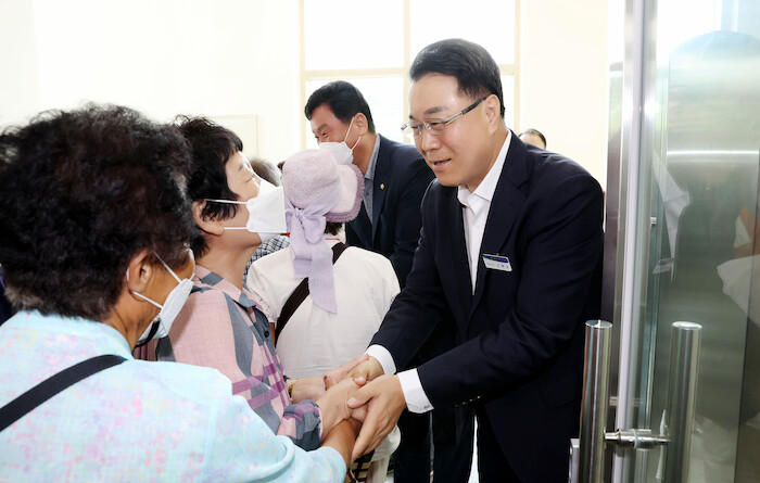 | ▲구복규 화순군수가 9일 열린 동복면 찾아가는 취임인사에 참석한 주민들과 인사를 나누는 모습(사진=화순군) |