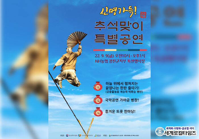 [세계로컬타임즈 이남규 기자] 전남 강진군에서 추석연휴 첫날 박회승 명인 초청 외줄타기 특별공연이 펼쳐진다.