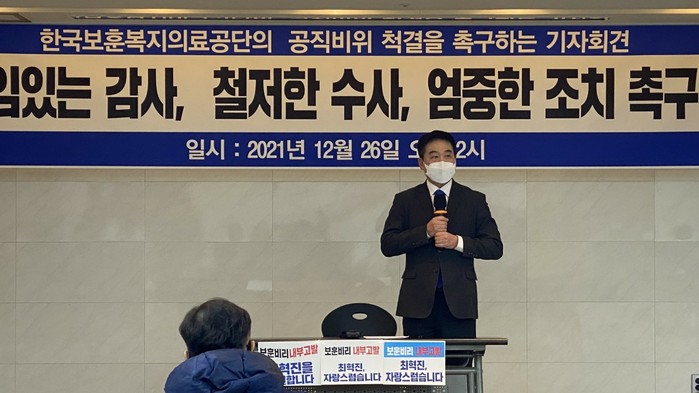 | ▲ 최혁진 한국보훈복지공단 이사가 '복지공단 공직비위 척결 촉구' 기자회견을 하고 있다.(사진=최혁진 한국보훈복지공단 이사) |