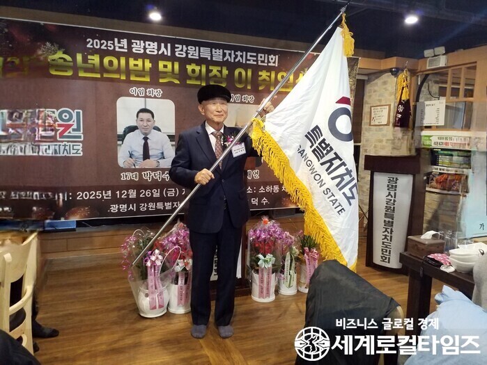 [세계로컬타임즈] 광명시와 강원특별자치도를 잇는 지역 교류의 중심축이 새롭게 재편됐다. 광명시 강원특별자치도민회 2026 연합회 제17·18대 회장 이·취임식이 12월 26일 오후 6시, 광명시 소화동에 위치한 채수어에서 성황리에 개최됐다.