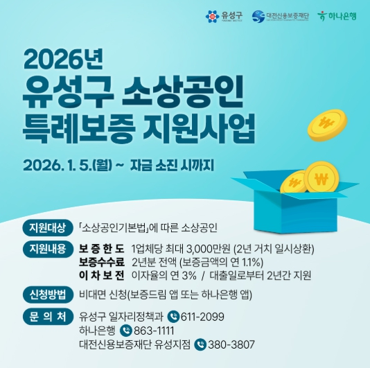 유성구 관계자는 “이번 사업이 자금 조달에 어려움을 겪는 소상공인과 창업 기업에 실질적인 도움이 되길 바란다”라며 “앞으로도 현장 중심의 맞춤형 지원을 통해 지역경제 활성화에 힘쓰겠다”라고 말했다.