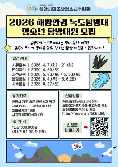 모집 대상은 천안시에 거주하거나 관내 학교에 재학 중인 2008~2013년생 청소년 12명이다. 신청 기간은 7일부터 오는 21일까지이며, 참가를 희망하는 청소년은 네이버 폼을 통해 접수하면 된다.