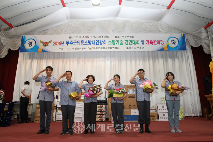 [세계로컬신문 조주연 기자] 전북 무주군 의용소방대 연합회가 17일 무주수련원에서 소방기술경연대회를 개최하고 그간 연마한 소방기술을 겨루고 우의를 다지는 자리를 가졌다.