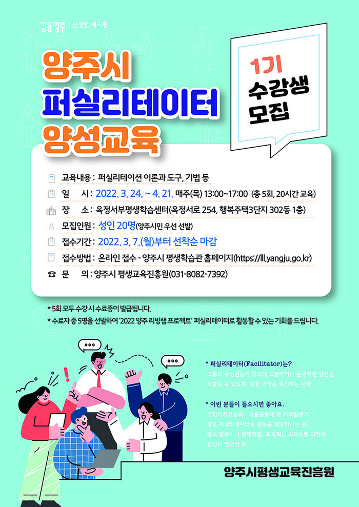 | ▲양주시는 3월 24일부터 소통전문가 육성을 위한 퍼실리테이터 양성과정 교육을 실시한다.(사진=양주시) |