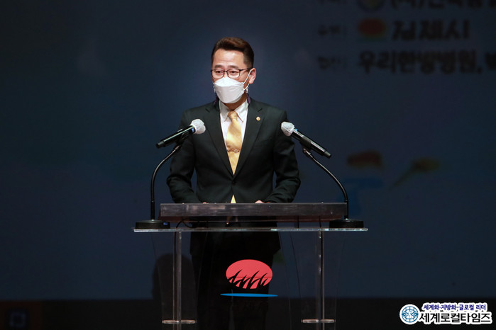 | ▲지난 18일 ‘2021 김제시민과 함께하는 통일음악회’에서 이장호 민족통일 김제시협의회장이 인사말을 하고 있다. |
