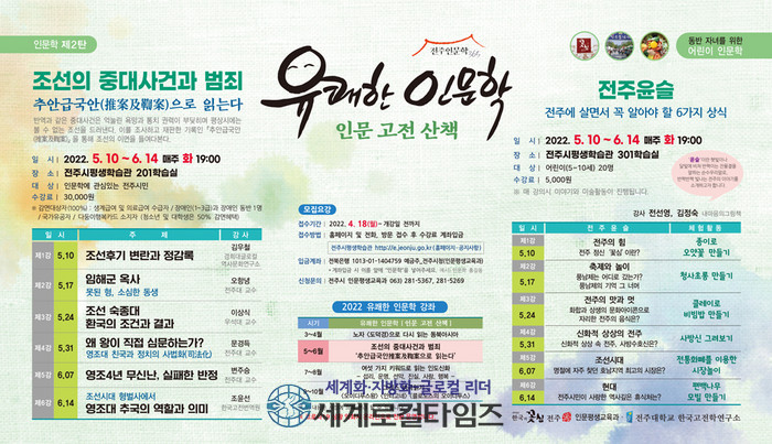 전주시 평생학습관은 오는 6월 14일까지 매주 화요일 오후 7시 전주대학교 한국고전학연구소와 함께 유쾌한 인문학 2탄 ‘조선의 중대사건과 범죄:추안급국안으로 읽는다’를 진행한다.