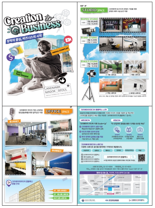 2021년 서울역에 개소한 ‘크리에이터미디어 콤플렉스’는 청년 기업들이 안정적으로 성장할 수 있도록 콘텐츠 제작 및 실시간 방송이 가능한 특화 제작 스튜디오와 독립 사무실 등을 제공하는 복합 공간으로, 미디어 새싹기업(스타트업)의 투자 유치와 사업 확장을 위한 전문 상담(컨설팅)을 진행하고 있다.