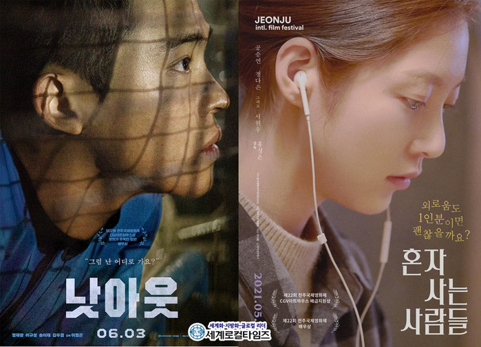 | ▲영화 ‘낫아웃’과 ‘혼자 사는 사람들’ 포스터 ⓒ전주국제영화제 |