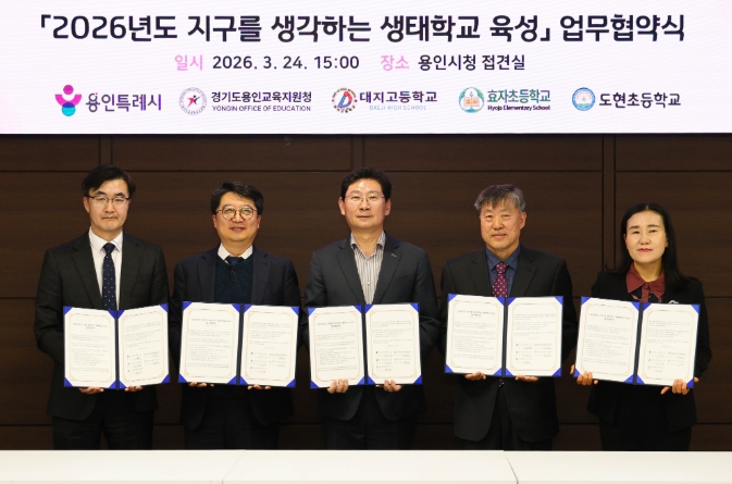 [세계로컬타임즈] 용인특례시는 24일 시청 접견실에서 용인교육지원청을 비롯해 3개 학교와 ‘지구를 생각하는 생태학교 육성사업’을 위한 협약을 맺었다.