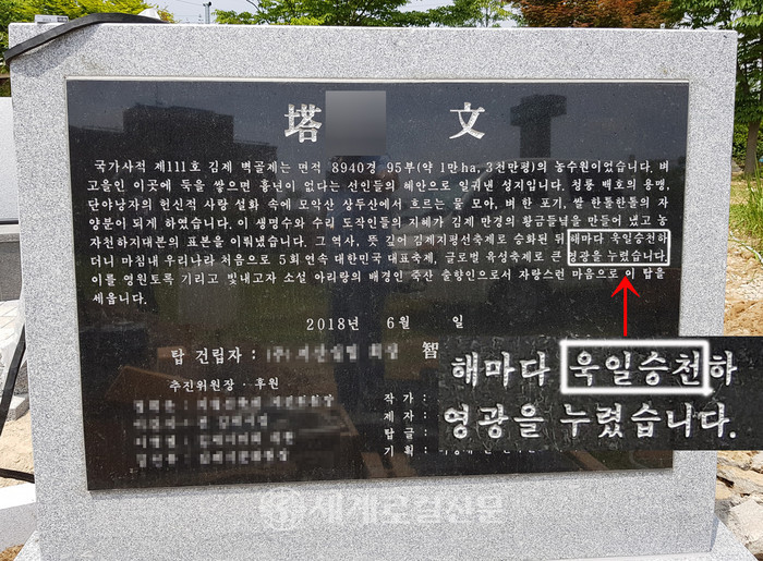 본지가 입수한 당초 탑문 사진에는 "그 역사, 뜻 깊어 김제지평선축제로 승화된 뒤 해마다 욱일승천하더니 마침내 우리나라 처음으로 5회 연속 대한민국 대표축제, 글로벌 육성축제로 큰 영광을 누렸습니다"라는 벽골제에 대한 표현이 각인돼 있었다.