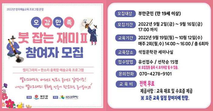 이번 ‘오감만족, 붓 잡는 재미Ⅱ’는 펜을 활용한 캘리그래피 실습과 민요·발림 배우기 등의 수업으로 총 6회차 진행된다.