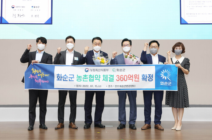 | ▲화순군이 농촌 지역 생활SOC를 획기적으로 확충하는 농촌지역 생활권 활성화 사업의 본격적 추진을 위해 농림축산식품부와 농촌협약을 맺었다. 15일 세종컨벤션센터에서 열린 협약식에서 구복규(왼쪽 3번째) 화순군수와 정황근(왼쪽 4번째) 농림축산식품부 장관, 화순군 관계자들이 기념촬영 하는 모습(사진=화순군) |