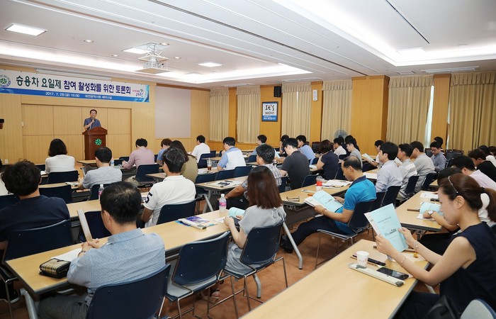 시는 승용차요일제 연착륙을 위해 28일 시청 3층 세미나실에서 자치구 및 동주민센터 승용차요일제 담당자 90여명이 참석한 가운데 ‘승용차 요일제 활성화를 위한 토론회’를 개최하고 공영주차장 요금할인혜택 50% 확대추진 등 다양한 방안을 논의했다.