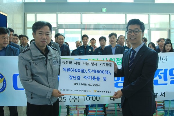 지난 25일 서부경찰서 로비에서 진행된 이번 나눔행사는 이주여성 또는 다문화 자녀을 위해 서부경찰서 직원들이 의류 및 아동도서 등 물품을 모아 서구 건강가정 다문화가족 지원센터에 지원하는 차원에서 전달됐다.