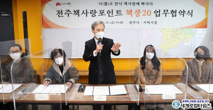 2일 전주시에 따르면 지난해 12월 31일 김승수 전주시장과 송천동 꿈아이서점을 비롯해 전주책사랑포인트에 신규 가입한 8개 지역서점의 대표가 참석해 ‘전주책사랑포인트 책쿵20’ 운영 업무협약을 체결했다.