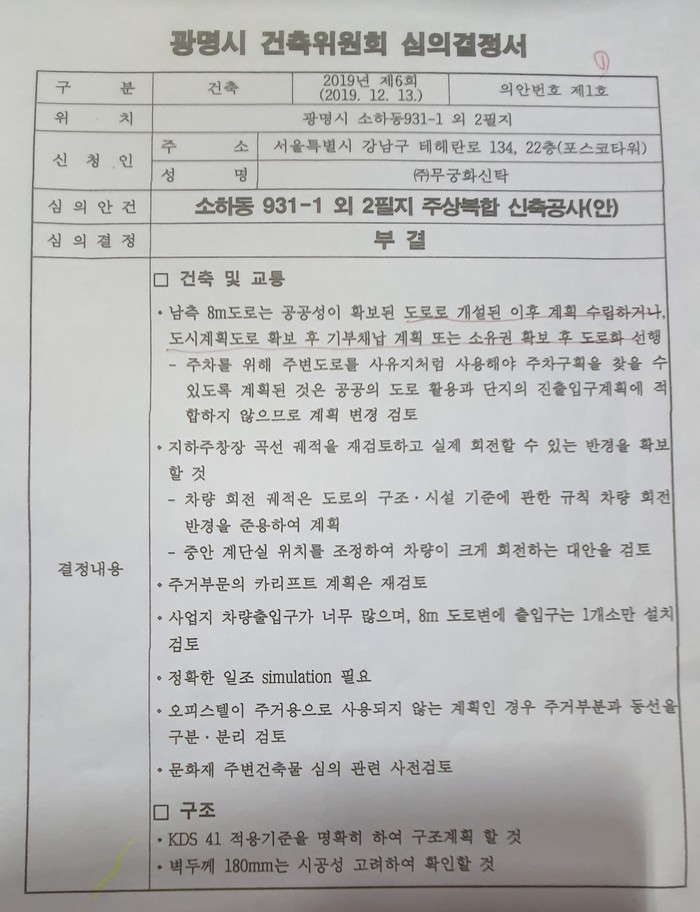 광명시 관계자는 취재진에 “사유지 현행도로를 매입 하라고 한 적 없다 설계사에게 물어봐라 시에서 도로를 매입 하라 했는지” 라며 기억이 나지 않는다 했지만 ‘광명시 건축위원회 심의결정서’에는 “남측8m도로는 공공성이 확보된 도로로 개설된 이후 계획 수립하거나 도시계획 확보 후 기부체납 계획 또는 소유권 확보 후 도로화 선행”이라고 했다.