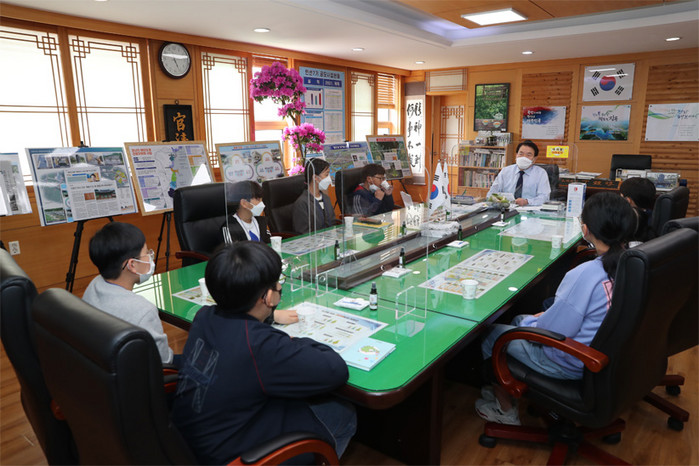 | ▲장흥군 어린이의회 의원들이 군의회를 방문 간담회를 갖고 지방의회 운영 등에 관해 설명을 듣고 있다.(사진=장흥군 제공) |