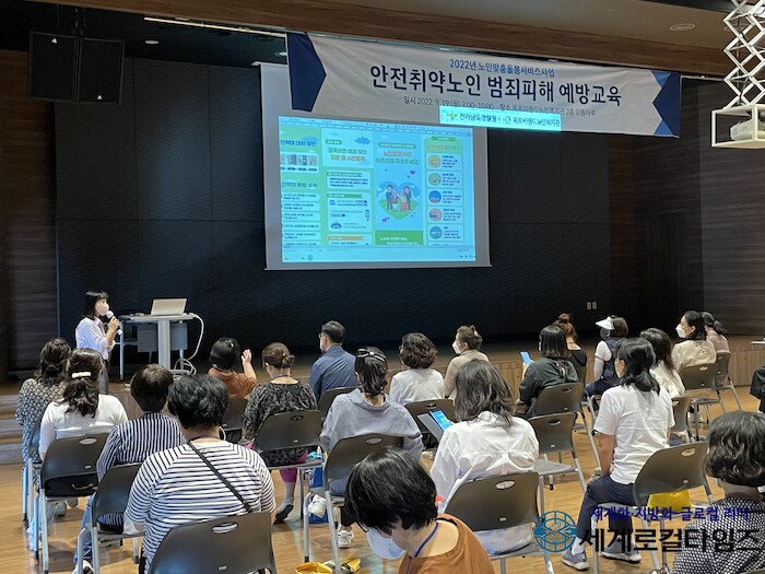 [세계로컬타임즈 김명진 기자] 목포경찰서(서장 이준영)는 19일 목포 이랜드 노인복지회관을 방문해 생활지원사를 대상으로 노인학대·노인성폭력·보이스피싱 예방 및 치매 노인 지문 등 사전등록 내용을 안내하는 범죄예방교육을 진행했다.