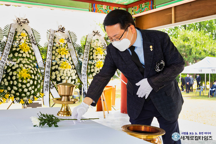 | ▲6일 오전, 현충일 추념식에 참석한 정헌율 익산시장이 헌화하고 있다.(ⓒ익산시) |