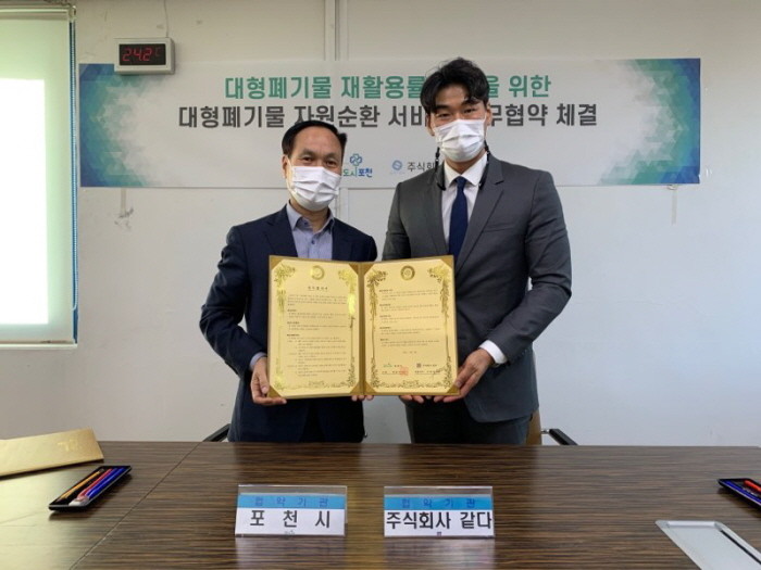 | ▲포천시는 대형폐기물을 스마트폰으로 간편하게 배출하는 모바일 수거시스템 도입을 위해 모바일 서비스 업체 '같다'와 업무협약을 체결했다. (사진=포천시 제공) |