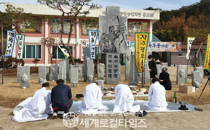28일 정읍시에 따르면 고부면 대뫼마을 주민과 부안군 시민단체는 지난 25일 대뫼마을 주변 유적지(사발통문 작성지 터, 모의탑, 위령탑) 등에서 풍물놀이를 시작으로 위령탑 제사 후 제문을 태워 동학농민혁명군의 넋을 기렸다.