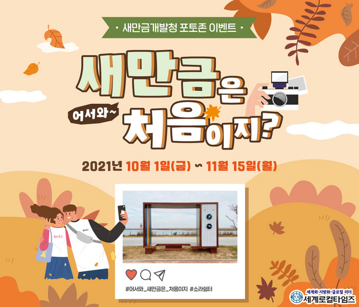 29일 새만금개발청에 따르면 오는 10월 1일부터 11월 15일까지 새만금 방조제에 설치된 4곳의 포토존에서 찍은 사진을 개인 SNS에 게시하는 ‘어서와 새만금은 처음이지?’ 이벤트를 벌인다.
