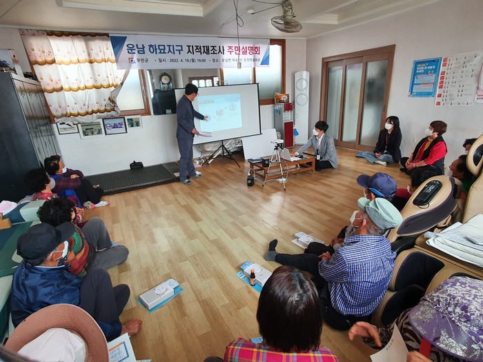 최근 개최된 운남 하묘지구, 몽탄 달산1지구 주민설명회에는 토지소유자와 주민 등 100여명이 참석했으며, 설명회에서는 지적재조사 사업 목적과 필요성, 사업개요와 추진절차, 토지소유자의 참여에 대한 중요성을 설명하고 토지소유자 의견 수렴을 비롯해 지적재조사 전반에 대한 궁금증을 해소하는 시간을 가졌다.