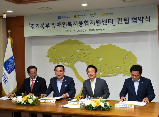 남경필 경기도지사와 이성호 양주시장, 김호겸 경기도의회 부의장, 박길서 양주시의회 의장은 26일 오전 경기도청 북부청사 도지사 집무실에서 ‘경기북부 장애인복지종합지원센터 건립 협약’을 체결했다.